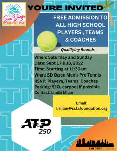 Watching professional tennis court side is one of the best ways to learn, improve and get inspired to play the game. Now high school players, coaches, parents and chaperones have the opportunity to attend the San Diego Open Men’s ATP250 event free of charge this Saturday and Sunday, Sept 17 and 18, at Barnes Tennis Center.