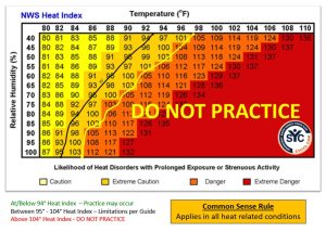 - Build Heat Endurance: Physical exertion and training activities should begin slowly and increase progressively. It can take up to a few months to build up conditioning in the heat. Start with shorter less intense practice sessions and longer recovery intervals in between. Keep each player’s individual health in mind and adjust accordingly.